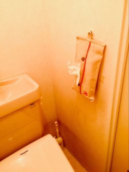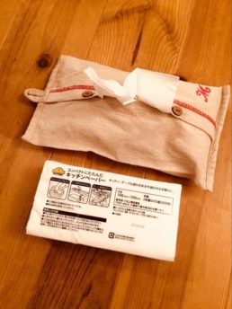 しばらくは手拭きとしてキッチンペーパーを使います。キッチンペーパーは使ったら下の簡易ゴミ箱に捨て、家族の感染を防ぎます。ゴミ箱は不要になればすぐに捨てられます。