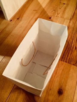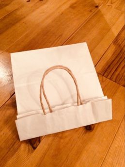 紙袋の上部に少し折り目をつけて中に折り込み、箱状にしたら、ビニール袋をかぶせます。