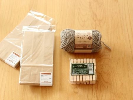 お菓子を入れるクラフトバッグ、吊るすためのウッドクリップ、ひもを用意します。クラフトバッグとウッドクリップは、作る日数分の個数が必要です。