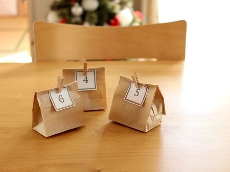 お菓子をクラフトバッグに入れ、口を折り返して日付のタグと一緒にウッドクリップでとめます。日付のタグは手書きでもいいですし、ネットで配布されているおしゃれなデザインの素材を印刷して使っても◎! クラフトバッグを折るときに、折り返しを多めにして高さを低くすると、コロンとかわいらしい印象になりますよ。