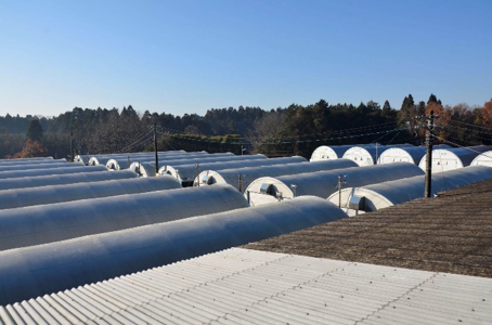 整然と並ぶ菌舎。内部はマッシュルームが育つのに最適な、温度17~18℃、湿度90%前後の環境に保たれています。