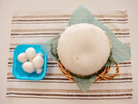 「通常のマッシュルームの2~3倍ほどのジャンボマッシュルームは、熟練の社員が大きく育ちそうなマッシュルームを選別し、それ以外のものを収穫して栄養を集中させ、大きく成長させることで誕生します。ジャンボマッシュルームよりもさらに大きい、直径13㎝以上のギガマッシュルームも同様に育てますが、ここまで大きくなるものは厳選して育てた100個のうち1個ほど。なんと、通常サイズでは10,000~20,000個のうちの1個! とても希少なものです。いずれも、しっかりした歯ごたえと濃厚な味わいが楽しめます。注文はお電話で承っており、ジャンボは1パック3玉で400円、ギガは個体差でお値段が変わり、約2,000~3,000円です。ギガは、ご注文いただいてから15日ほど日数がかかります」