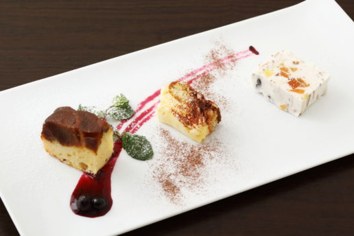 Cランチのデザート。左から焼きリンゴのケーキ、ティラミス、中にドライフルーツが入ったシチリア地方のお菓子カッサータ
