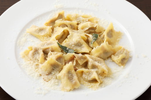 こちらは日曜日などに大量に作った料理の余り肉や野菜の切れ端を詰め物の素材に使ったのが始まりという、ピエモンテ風アニョロッティ ダル プリン1650円。ロースト肉やスパイス、パスタフレスカソースのコクが味に深みを与え、お祝いの席やクリスマスなどごちそうの代名詞にもなっている料理。