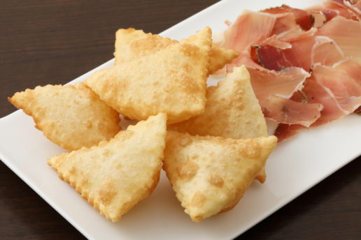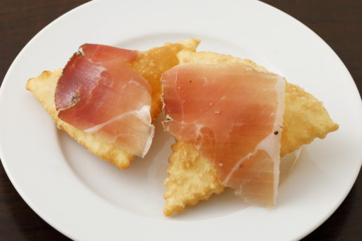 揚げパンといっても給食などでおなじみの砂糖をまぶしたものとはまったく違い、中が空洞になっているのが特徴のひとつ。イタリアのエミリアロマーニャ州では定番の前菜料理として親しまれ、揚げたてのパンと生ハムの塩気が好相性。一度食べたらやみつきになること間違いなし。