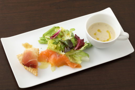 Bランチのサラダと前菜のトルタフリッタ、さつまいものスープ