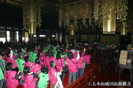 開運豆まきに申し込むと、大本堂内での御護摩祈祷中に豆まきができます。裃(かみしも)を着け、開運招福と災難消除を祈って福豆をまきます。