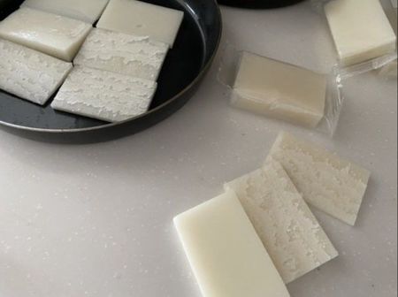 ①もちは厚さを3等分に切り分けます。オリーブオイルを入れたフライパンに並べ弱火にかけます。きっちり並べなくても、あとから形を整えられるので、すき間があってもOKです。