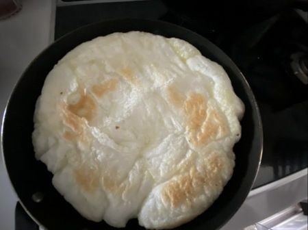 ②もちがやわらかくなってふくらんできたらへらなどで押して形を整えてひっくり返し、両面をこんがり焼きます。