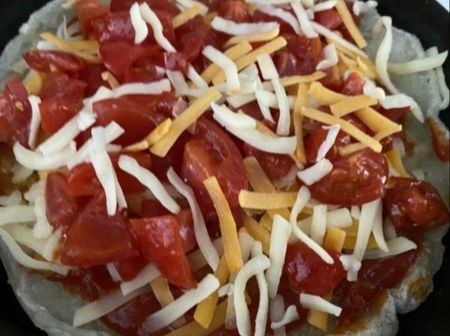 ③トマトソースを塗り広げ、ざく切りにしたミニトマト、短冊切りにしたベーコン、チーズをのせ、オリーブオイル(分量外)をふります。