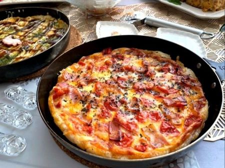 もちピザは、もちを薄く切ってフライパンで焼き、具材をのせてさらに焼きます。具材は本格ピザ風なトマトソースとミニトマト、ベーコンとチーズです。カリッもちっとした食感に、トマトの味ととろ~りチーズがばっちりなおいしさです。