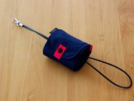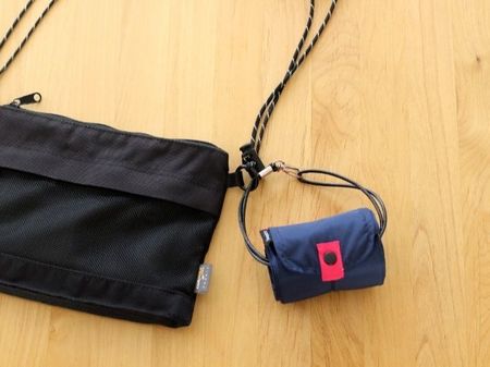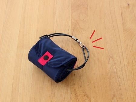 買いものに行くときは、バッグの持ち手やストラップにぶら下げて使います。こうしておけば、小さいバッグでもパンパンにならず持ち運びOK♪