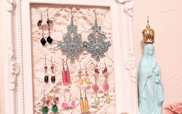 【100円ショップの額縁にドイリーを貼るだけ】ピアスディスプ…
