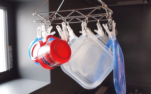 乾きにくい保存容器はピンチハンガーに吊るす!